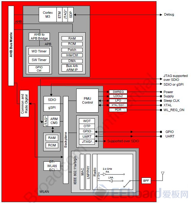 从官方提供的BCM43364的规格书可知,这是一颗单一的2.4GHz频段的WiFi芯片,在这个模块上,用两根天线说不通。翻阅大量资料才发现,这个板型的模块本身就有好几个系列,采用了博通不同的WiFi芯片,甚至说有的还包括BLE功能,比如BCM94343WWCD1_EVB开发套件,集成的是博通BCM4343WiFi/BLE组合芯片,显然,在较为理想的设计中,如果WiFi和蓝牙共用天线,它们是不可以同时工作的(如果不考虑相互干扰,可以同时接收),因此,选用双天线的设计是势在必行的,而BCM4343又是在封装上兼容BCM43364的产品,所以在设计上,电路基本保持了一致(基本算是懒的做BOM的变动,反正对于这些公司,这点物料成本不算什么,更何况开发板本身就不存在巨量的情况),以至于出现了两根天线让人困惑的事。 BCM43364算是一款组合型芯片,内部集成了IEEE802.11b/g/n MAC/基带/收音机、PA、LNA、内部RF开关,不仅减少整个WiFi方案的成本,更能进一步缩减PCB的布局空间,以适应结构更小的电子产品。BCM43364支持SDIO以及SPI接口,在功耗控制方面,BCM43364内部集成了一个ARM Cortex-M3处理器以及包含整个WLAN子系统功能的存储空间,可以在尽可能少唤醒主应用处理器的情况下通过内置处理器实现WLAN功能,进一步降低整个WiFi方案的功能。 ![]()