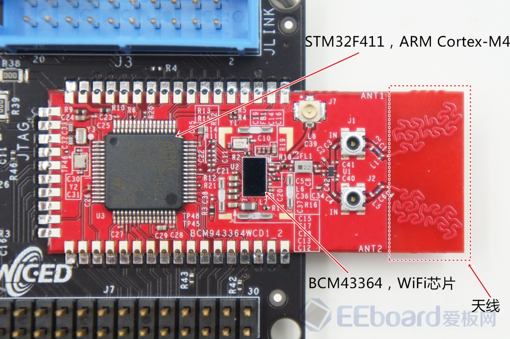 就BCM943364WCD1_EVB WICED WiFi开发套件本身而言,核心当然是上面的WiFi模块,但是对于刚入手或者想基于原型版直接DIY一些物联网应用,那底板的作用还是不可或缺的,板载的功能按键、LED指示灯、调试器等都可以帮助工程师尽快熟悉和扩展物联网应用的功能。 拆下WiFi芯片上的屏蔽罩,我们能看到博通的这颗BCM43364 WiFi芯片,电路相对来说还是比较简单的,不过,让人比较疑惑的是WiFi天线怎么会有两根? ![]()