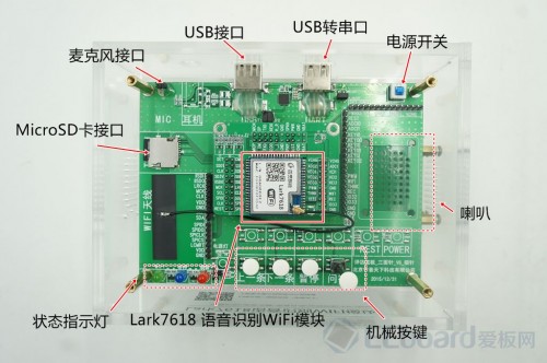 另外宇音天下还针对这款Lark7618的语音识别核心板定制了可扩展底板以及亚克力外壳,底板和外壳需要另外选购,如下图 ,![]() ![]()