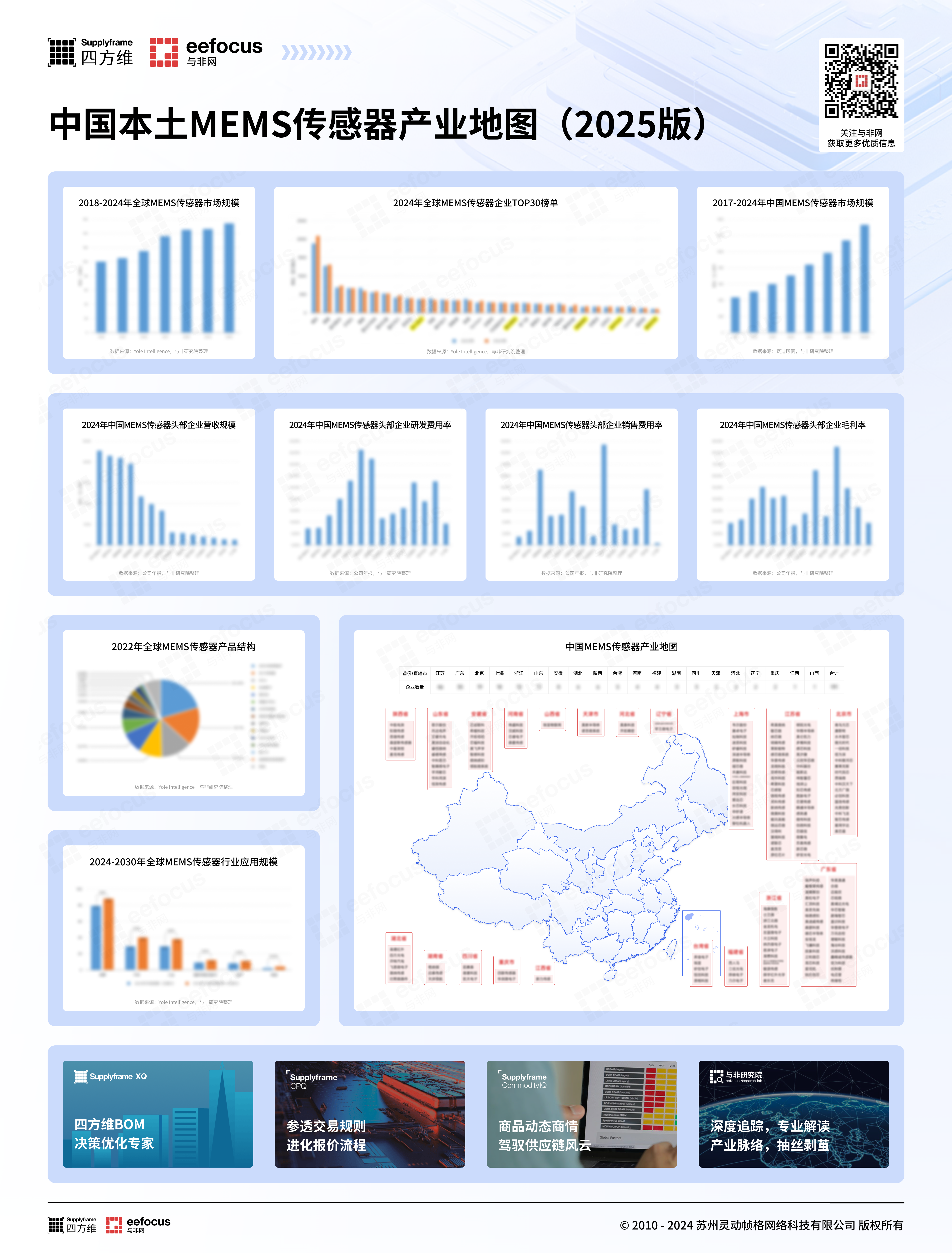 此外,对比2023年的数据,可以发现:2024年MEMS传感器领域国际厂商的排名也有不少变化,比如特励达MEMS和台积电跌出前30排名,取而代之的是由?Sofradir和Ulis两家公司合并成立的专注于红外探测器的法国公司Lynred,以及由瑞士Sensirion Automotive Solutions AG全资控股的传感器厂商盛思锐;楼氏电子将消费级MEMS麦克风业务出售给美国边缘AI公司Syntiant等。