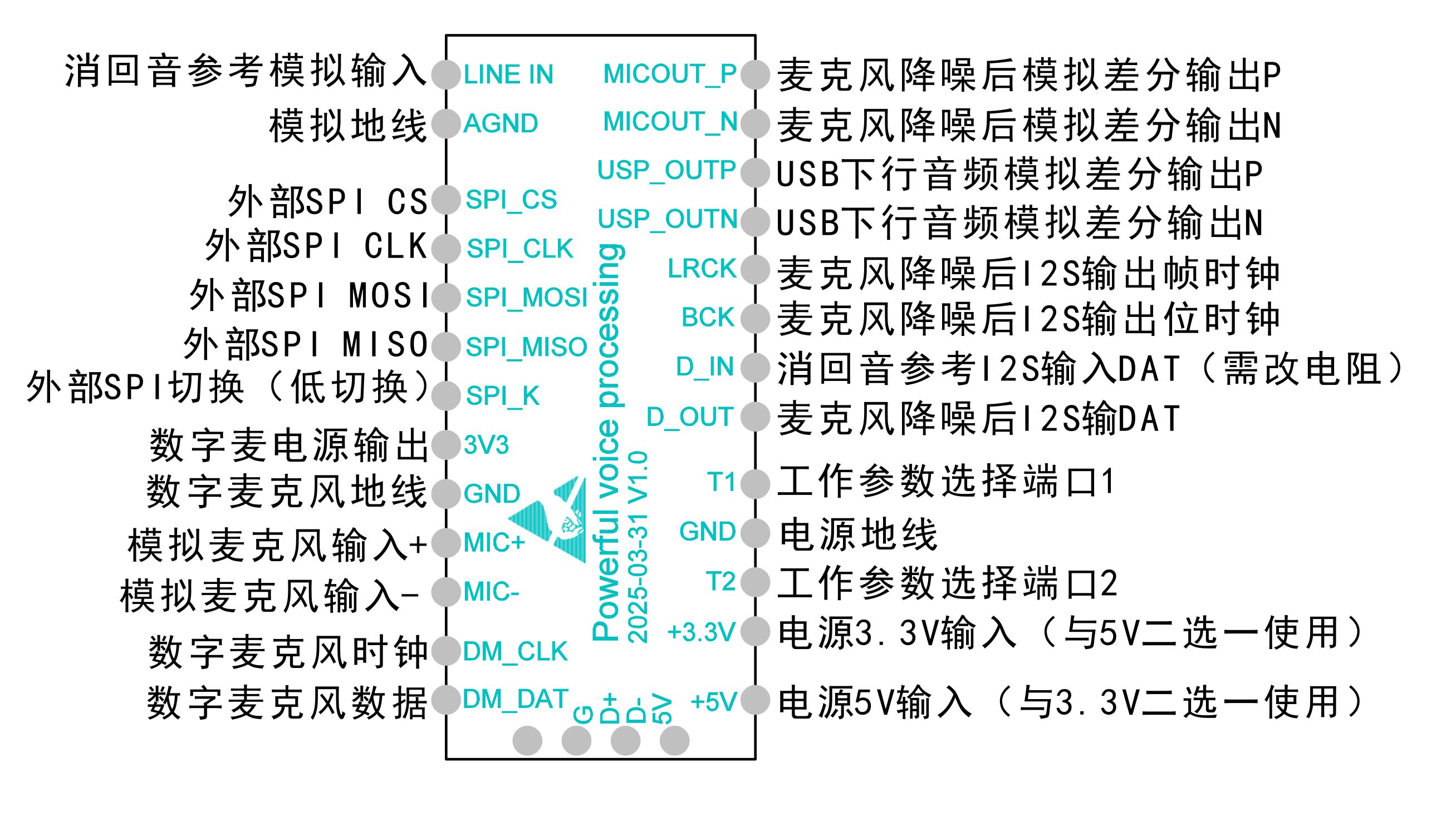 • 扩展端口丰富:含 I2S 数字音频接口(支持 48kHz 采样率、16bit 位深)、T1/T2 参数选择端口(可切换拾音距离 10cm-8m)、SPI 控制端口(实时调整降噪强度、波束角度等参数),满足个性化调试需求??
